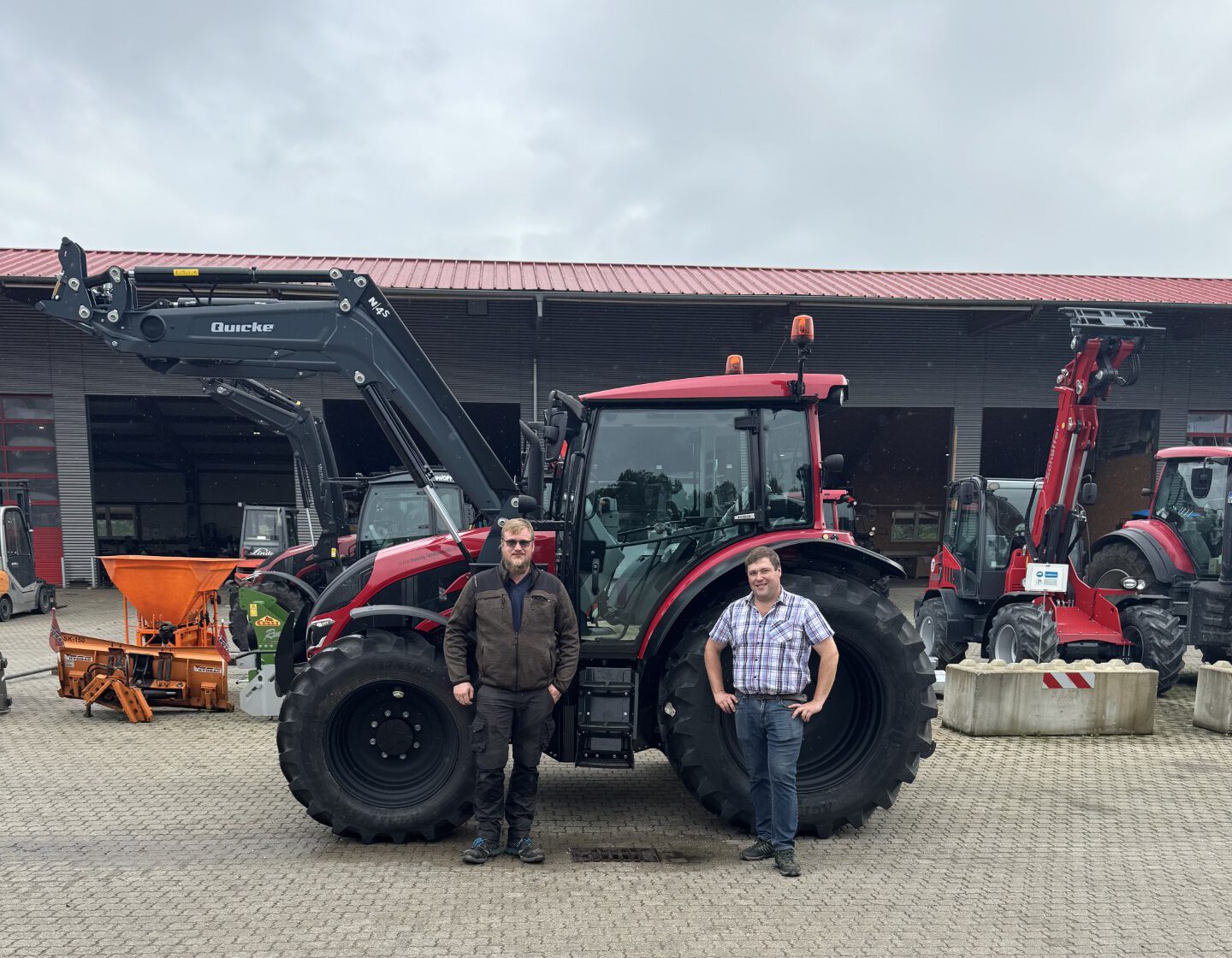 Foto einer Maschinenübergabe. Man sieht unseren Verkäufer Martin mit dem Kunden Florian Zierer vor einem roten Valtra Schlepper A105H4.